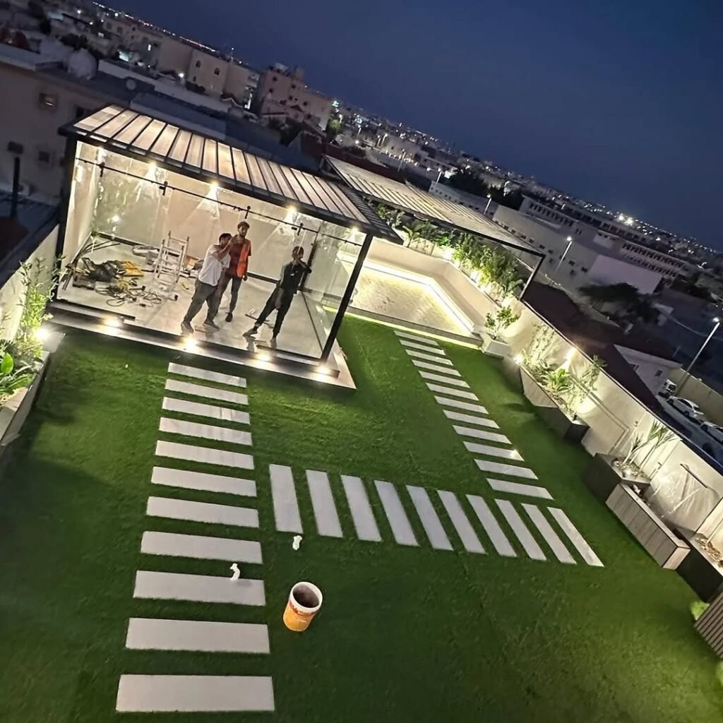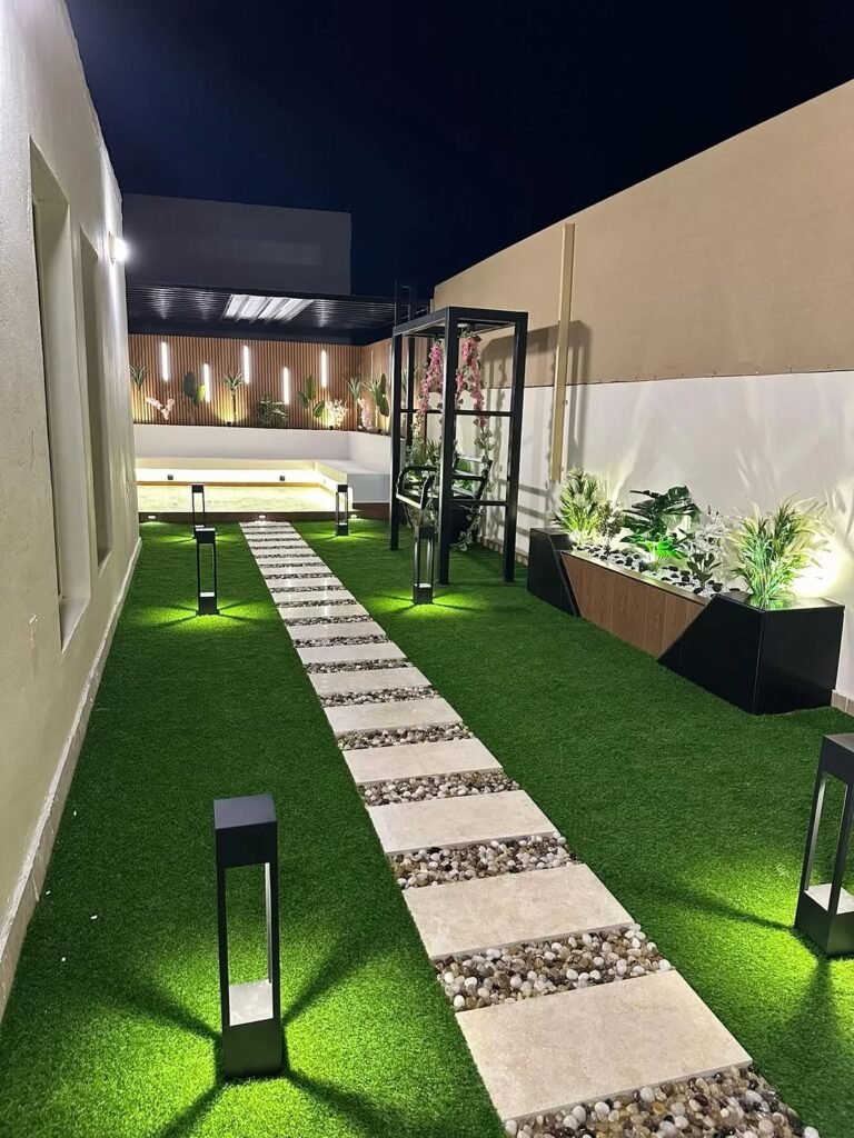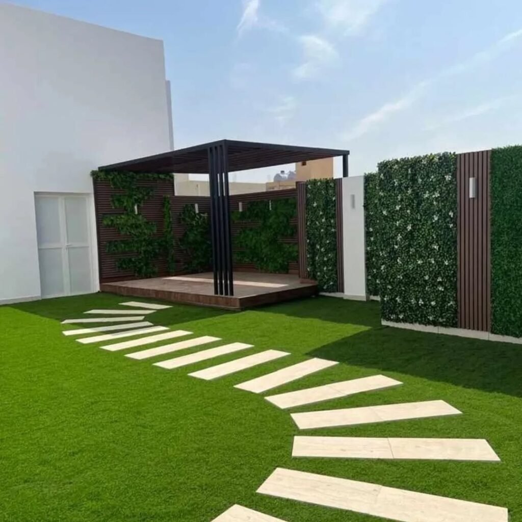 علاوة على ذلك، يتمتع العشب الصناعي بالتحمل العالي للظروف المناخية القاسية. في جازان، حيث يمكن أن تتراوح درجات الحرارة بين الحارة والرطبة، يبقى العشب الصناعي قليل التأثر بفعل العوامل الجوية. إذ لا يذبل أو يتآكل بسهولة مثل العشب الطبيعي. بدلاً من ذلك، يحتفظ بلونه الأخضر الزاهي طوال السنة، مما يجعل الحديقة تبدو دائمًا في أفضل حالاتها.